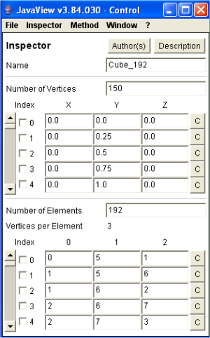 Surfaces in JavaView are point sets with additional information about the elements (filled polygons) that form it. Each element (e.g. triangle, quadrilateral) is defined by the set of points that have to be connected. The ordering of vertices in the definition of an element determine its orientation (i.e. direction of its normal vector).Author Information, Description and Name
