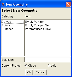 Opens a dialog where you can select a type of geometry to create in the active display.