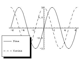| This shows sine and cosine curves with a legend. JavaView fails : Graphics inside a rectangle command are not parsed. | In[1]:=