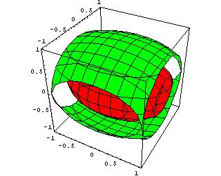 <<Graphics`ContourPlot3D` In[2]:= data = Table[ x^2 + 2*y^2 + 3*z^2, {z, -1, 1, .25}, {y, -1, 1, .25}, {x, -1, 1, .25}]; In[3]:= gl = ListContourPlot3D[data, MeshRange -> {{-1, 1}, {-1, 1}, {-1, 1}}, Lighting -> False, Contours -> {1.5, 3.}, Axes -> True, ContourStyle -> {{RGBColor[0, 1, 0]}, {RGBColor[1, 0, 0]}}] In[4]:= JavaView[gl] |