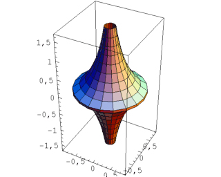 << Graphics`SurfaceOfRevolution` In[2]:= gPsd = SurfaceOfRevolution[{ Exp[-Abs[x]], -Sign[x](Sqrt[1 - Exp[-2 Abs[x]]] - Log[(1 + Sqrt[1 - Exp[-2 Abs[x]]])/Exp[-Abs[x]]])}, {x, -2., 2.}] In[3]:= JavaView[gPsd] |
